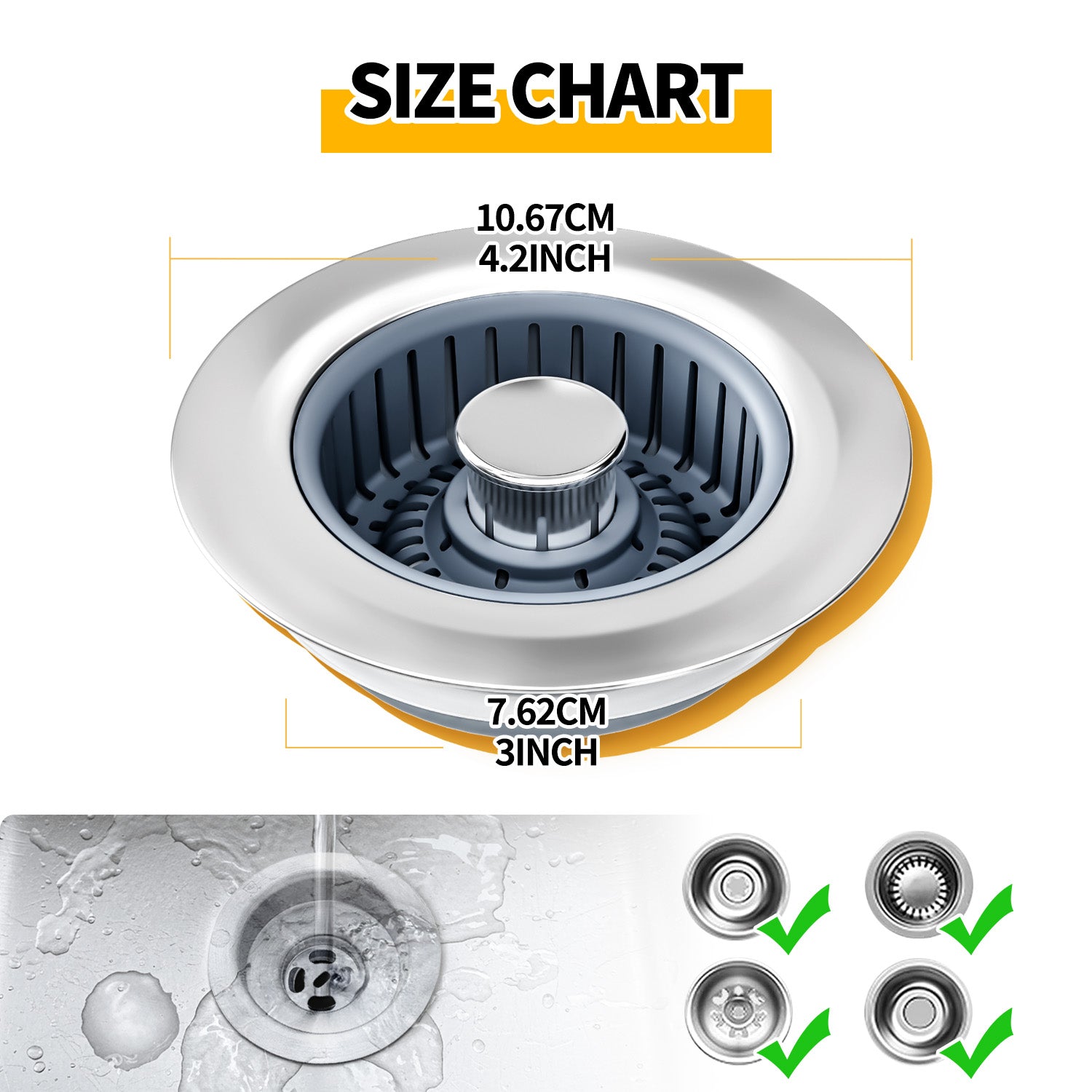 - Perfect Fit for Standard Sink Drains: Fits most US-standard 3-1/2" drain openings (3"–3.38") with a height of 1.7". Includes a food strainer basket with a 1" depth for effective filtering. Please confirm your sink dimensions and strainer depth before purchase.